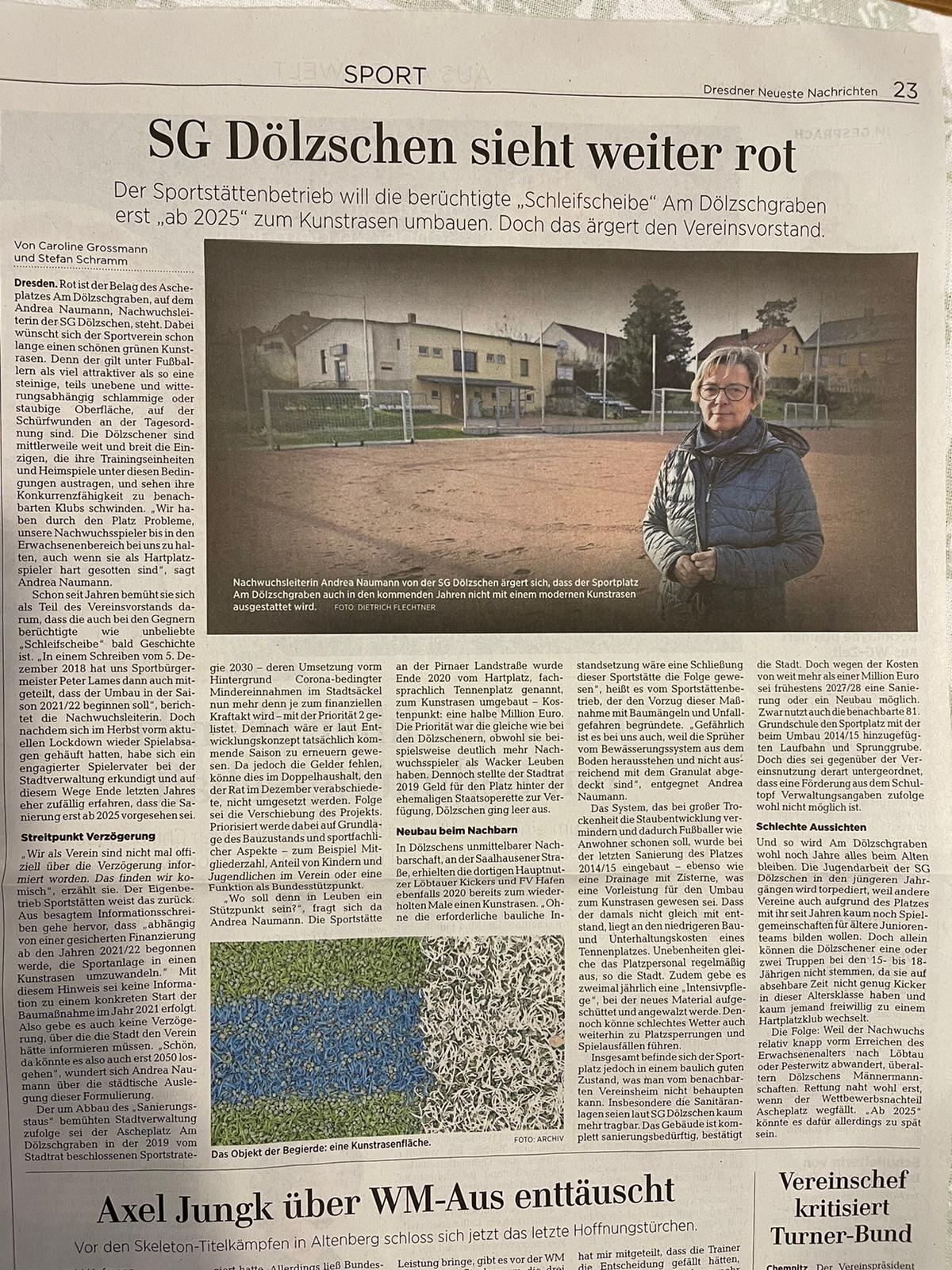 Artikel der DNN vom 26.01.2021 zum Zustand des Platzes und Sportheims der Sportanlage Am Dölzschgraben.