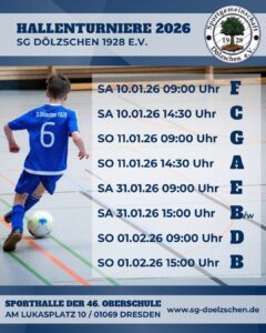 7. Nachwuchs-Hallenturnier SG Dölzschen 1928 Am Samstag ist es soweit und unser erstes Turnierwochenende steht an, mit den Turnieren der F- und C-Jugend am Samstag und der G- und A-Jugend am Sonntag.  Wir laden euch dazu herzlich in die Sporthalle der 46. Oberschule, Am Lukasplatz 10, 01069 Dresden ein.