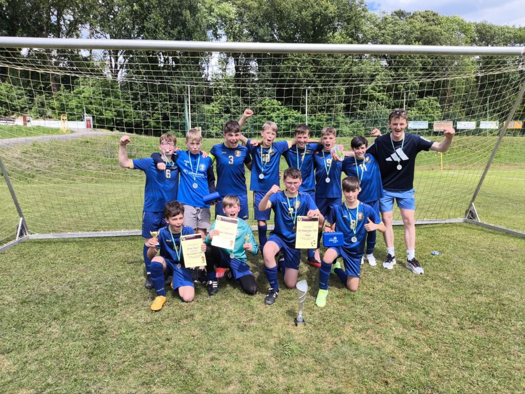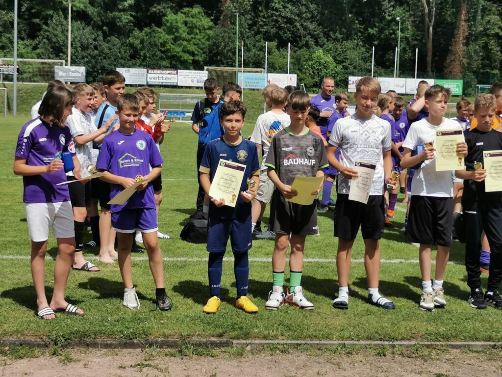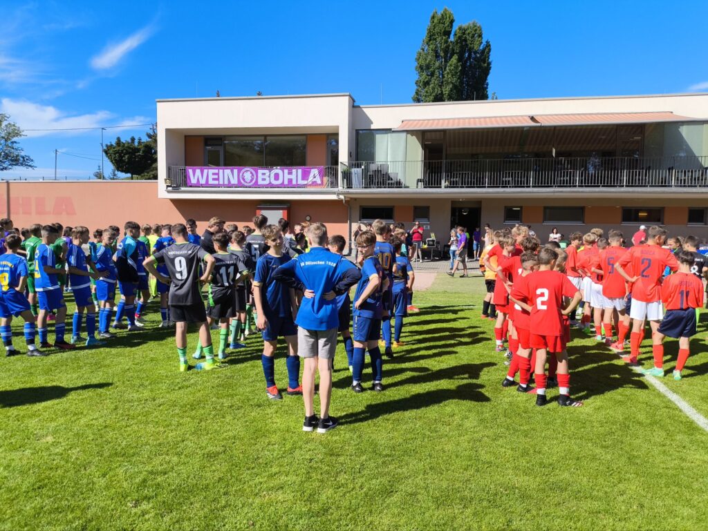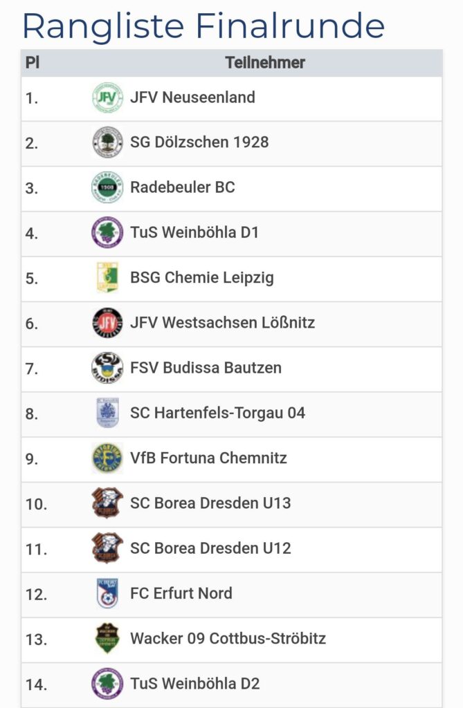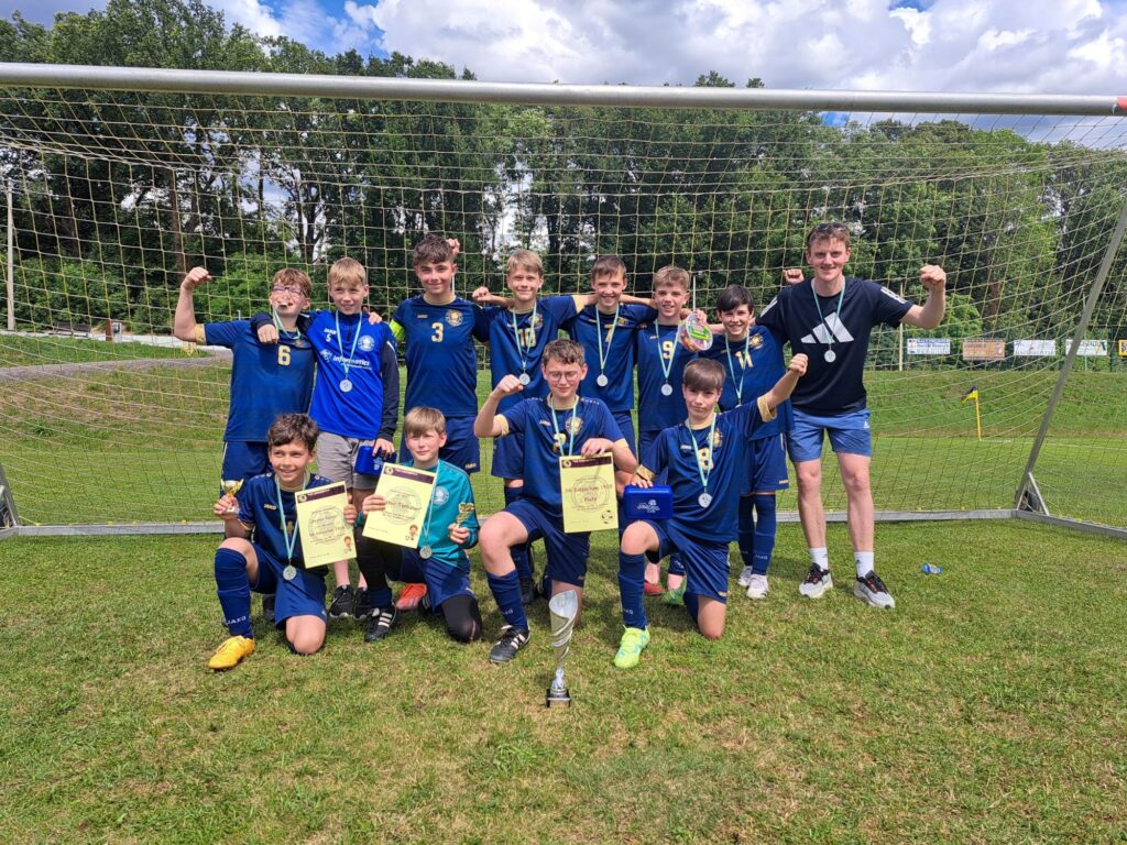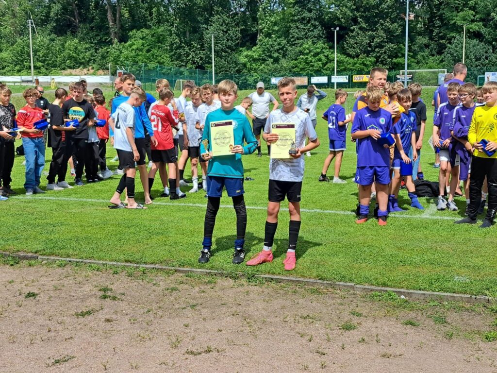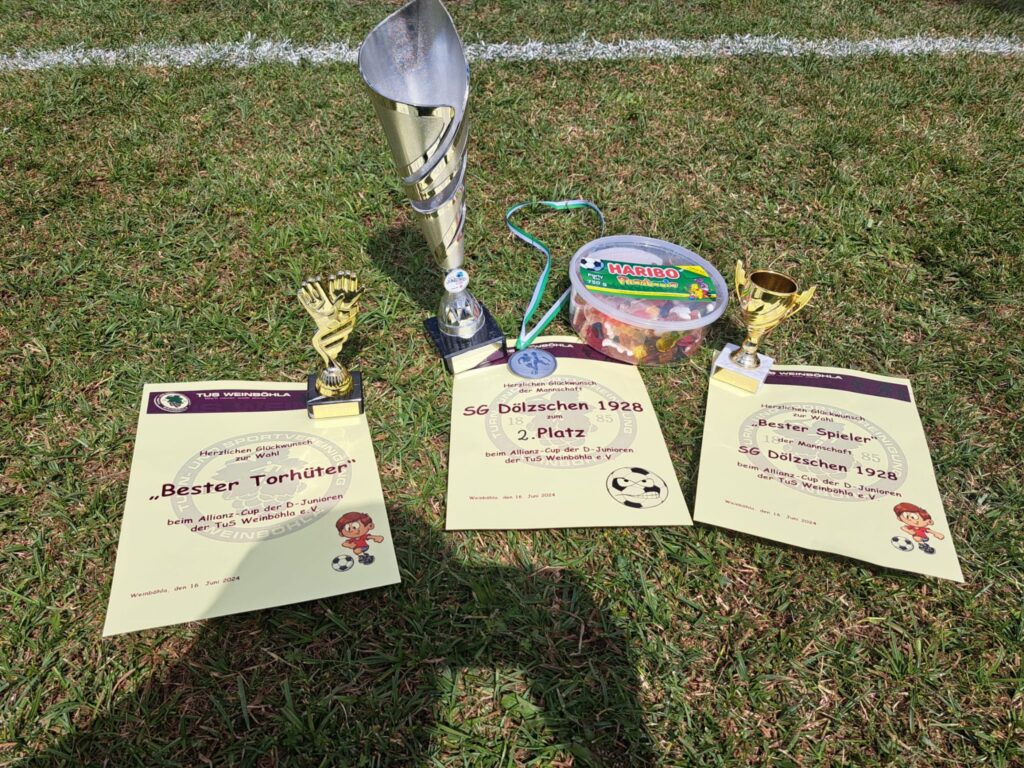 Kurz vor den Ferien stand nochmal ein echtes Highlight für unsere D1-Jugend an. Der Allianz-Cup in Weinböhla mit einem hochklassig besetztem Teilnehmerfeld sollte unseren Jungs vor den Ferien nochmal alles abverlangen, aber auch die Möglichkei bieten zu zeigen auf welchem Spielniveau man mittlerweile nicht nur mitspielen, sondern sogar selbst spielbestimmend sein kann. Gespielt wurde in zwei 7er-Gruppen auf 4 Spielfeldern, zweimal Rasen, zweimal Kunstrasen, wobei unsere Gruppe auf dem Kunstrasen spielte. Nach 6 Gruppenspielen mit vielen knappen Ergebnissen, erreichte man das Viertelfinale, Gegner sollte die BSG Chemie Leipzig sein. In einem hochklassigen Spiel setzte man sich schließlich im 9 Meter-Schießen durch und der Jubel war groß über den Halbfinaleinzug. Die sehr sommerlichen Temperaturen sorgten dafür, dass nach der Gruppenphase quasi alle Mannschaften „auf dem Zahnfleisch“ gingen und die Spiele über Kleinigkeiten entschieden wurden. Auch im Halbfinale sollte es somit wieder ins 9 Meter-Schießen gehen, wieder mit dem glücklicheren Ende für unsere Jungs – FINALE. Gegenüber stand der JFV Neuseenland. Auch im Finale lieferten unsere Jungs nochmal ein tolles Spiel ab, mit Chancen auf beiden Seiten. Der JFV nutzte eine dieser Chancen und schaffte es, die sich anschließenden Angriffswellen unserer Jungs zu verteidigen und holte sich den Turniersieg – Glückwunsch! Aber auch der zweite Platz in diesem Teilnehmerfeld war ein voller Erfolg für unser Team und ließ Spieler, Trainer und Eltern jubeln. Außerdem wurde Konsti noch alles bester Torhüter des Turniers ausgezeichnet und Jannis von unseren Trainern als bester Dölzschner Spieler des Tages ausgezeichnet. Weiter so!