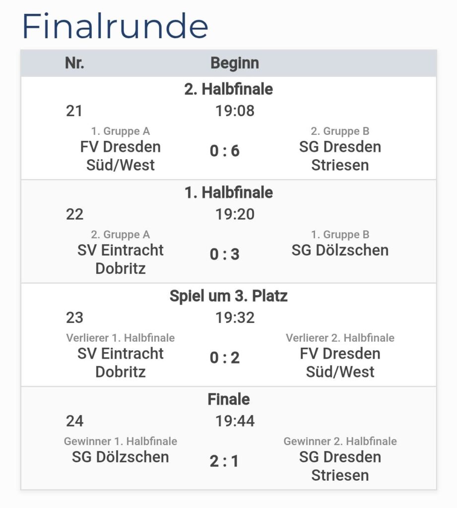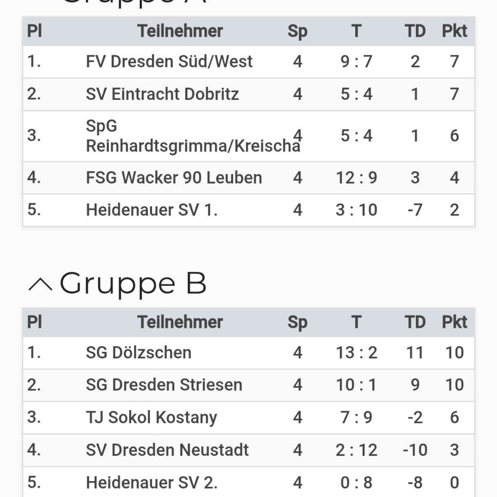 In der Gruppe setzte man sich als Gruppenerster vor dem 2011er Jahrgang der SG Dresden-Striesen durch. TJ Sokol Kostany, eine gut aufspielenden tschechischen Mannschaft und die außer Konkurrenz angetretenen U15 des Gastgebers folgten auf den Plätzen, wobei eine Wertung der Spiele nichts am Weiterkommen verändert hätte. Besonders erfreulich für das Trainerteam, dass in den vier Gruppenspielen vier verschiede Spieler im Tor zum Einsatz kamen und man dennoch in jedem Spiel sowohl im Aufbauspiel als auch beim Herausspielen von Torchancen überzeugte.