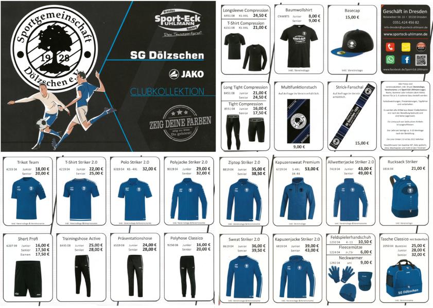 Geht einfach auf die Website: https://www.jako.de/de/team/sg_doelzschen/ oder ins Sportgeschäft auf die Reisewitzer Straße 31 und holt sie euch. Ihr könnt alle Sachen und Taschen auch mit Nummer, Name oder Initialien veredeln lassen!